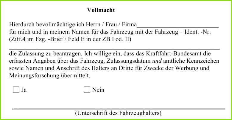 In der vollmacht für die zulassung tragen der halter des kfz und der bevollmächtigte ihre namen und adressen ein.
